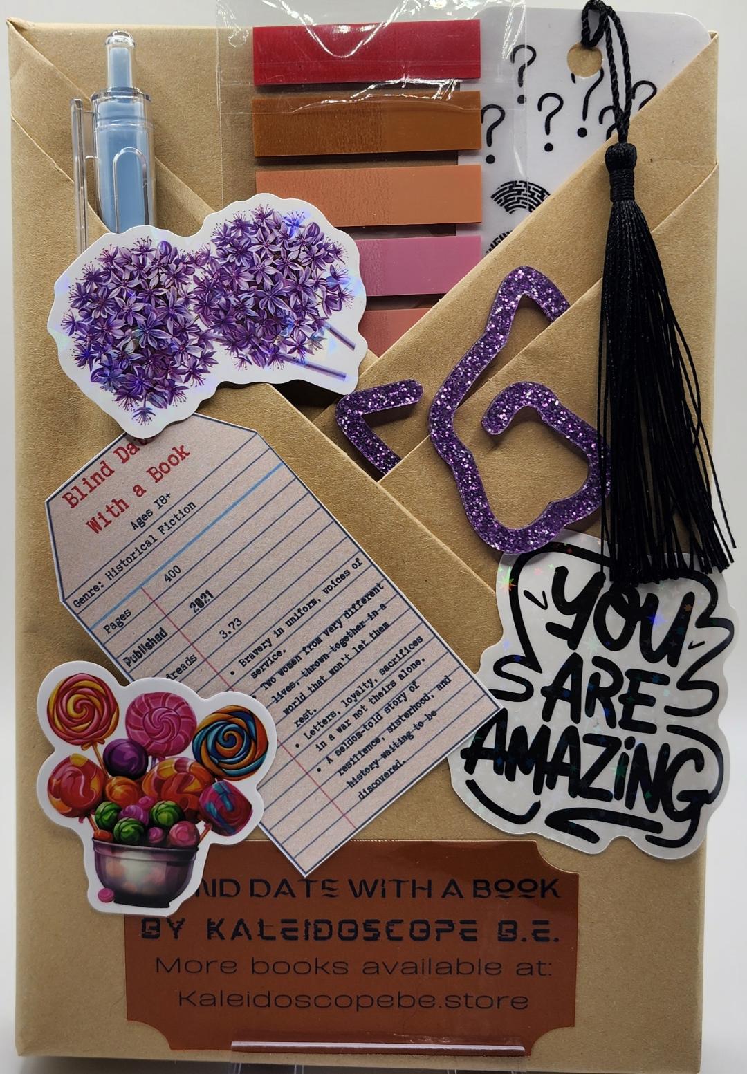 The book comes with a pen, bookmark, annotation sticky notes, and glitter paperclip.