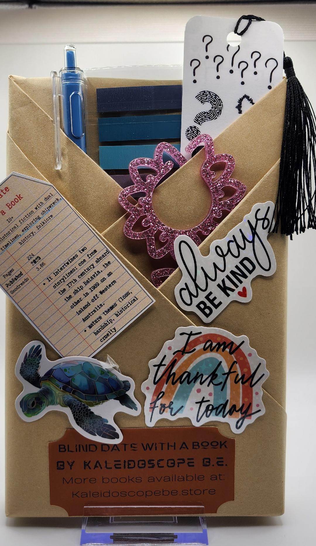 The book comes with a pen, a bookmark, annotation sticky notes, and a glitter paperclip.